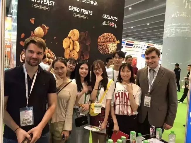 学生在广交会与外国友人一起工作